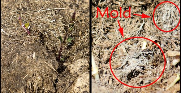 (Fig 1) Left: Compacted grass clippings as mulch. Right: Mold development from grass clippings